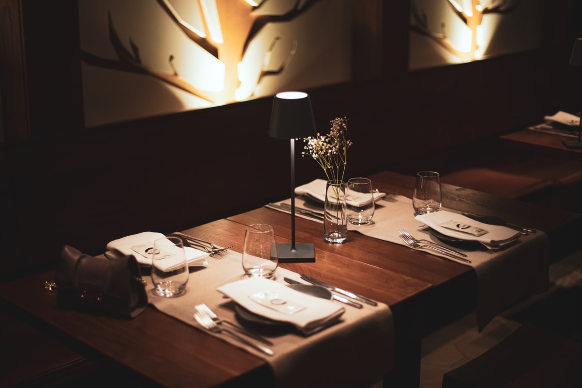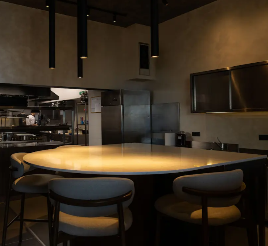 Ambijent je moderan i minimalistički, sa fokusom na detalje i atmosferu koja omogućava gostima da se potpuno posvete hrani.